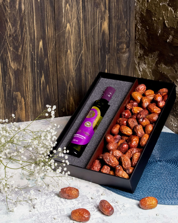 بسته نوژا دارای 580 گرم عناب خرمایی پریموم و روغن زیتون به انتخاب شما 235میل یا 465 میلی . ابعاد جعبه 30در 22 با ارتفاع7 سانتی متر.
